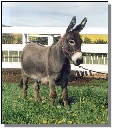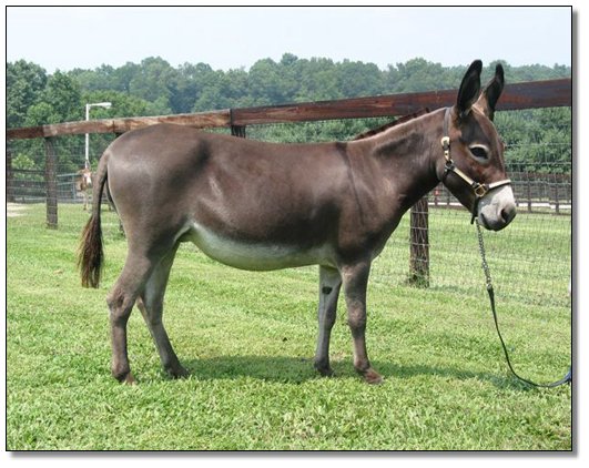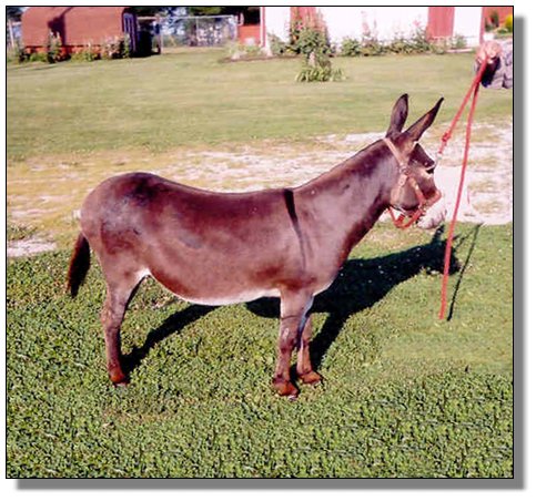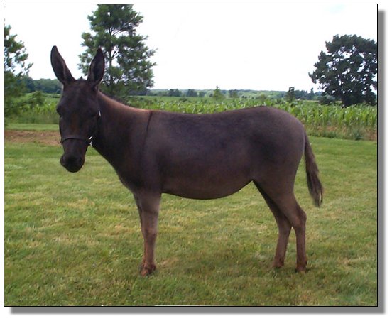 Here is a jennet that’s at her peak in producing top quality foals. Diamiss is an excellent breeding jenny, with a nice neat head, good bite, straight legs, good body conformation, and wonderful disposition plus easy breeder. Always produces a real nice dark brown foal, the kind you like to have in your herd. She is bred to Merlin, a 29.5" brown jack, a grandson of Top Gun.