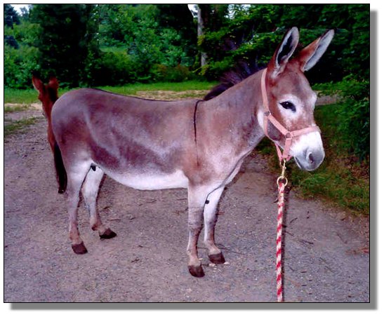 Velvet is a beautifully built, dark jennet with a strong show presence. She is registered as a dark brown, but can be more accurately described as smoky black. Her sire, MW Sidney, is a very stocky & correct Buster son who produces strong color, having sired sorrel, jet black, and several smoky black, black nosed foals. Velvet has proven herself in the show ring; 4th in 2 year old jennets at 2003 Cheers for Ears (20 entries) & NMDA Reserve Champion Jennet, 2003 Ohio State Fair. Take this opportunity to add this quality, coming 3 year old, with possibly a new black bloodline, to your breeding program! She’s hard to part with!