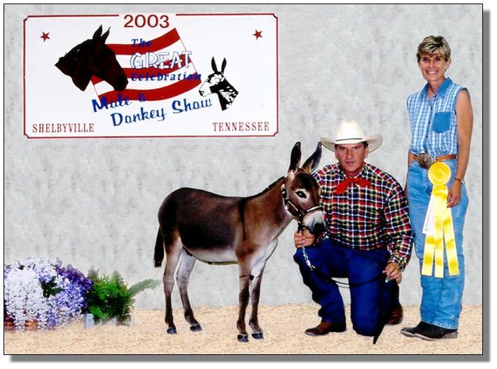 ![]() ![]() ![]() ![]() Photos below taken July 12th, 2008, after winning a very competitive color class showing against all sizes of donkeys. She also won the three and over ACOSA Jennets class. ![]() ![]() (Click photos to enlarge) | ||||||||||||||||||||