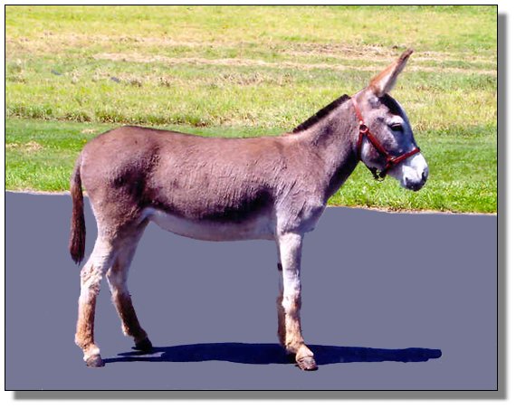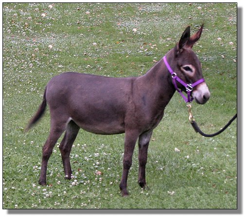 Here is a jennet that’s at her peak in producing top quality foals. Diamiss is an excellent breeding jenny, with a nice neat head, good bite, straight legs, good body conformation, and wonderful disposition plus easy breeder. Always produces a real nice dark brown foal, the kind you like to have in your herd. She is bred to Merlin, a 29.5" brown jack, a grandson of Top Gun.
